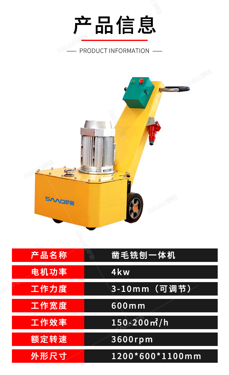 一、產品簡介: 鑿毛銑刨一體機,不需要空壓機,純電動,主要用于高速公路,高鐵,橋面及箱梁混凝土面層剔鑿,建筑物地面及市政工程混凝土表面鑿毛,修補,翻新,二次加固。室