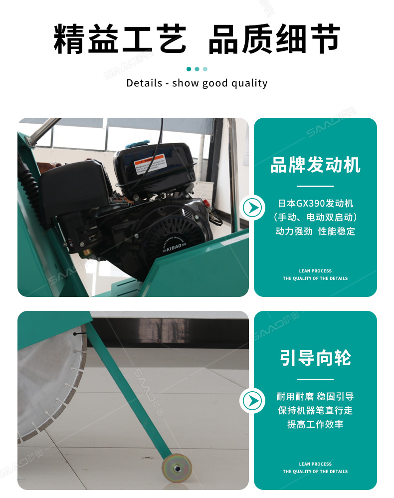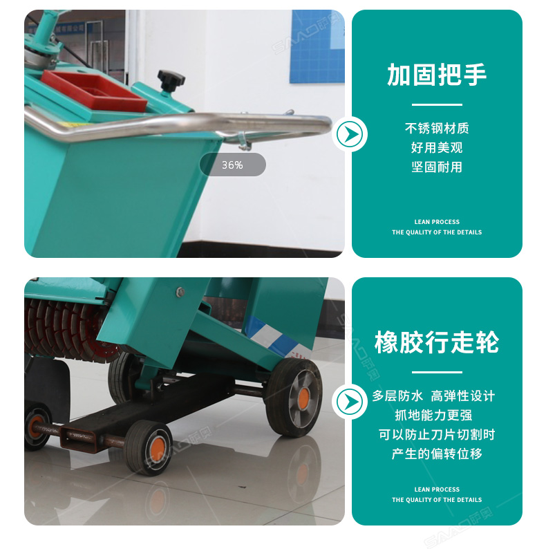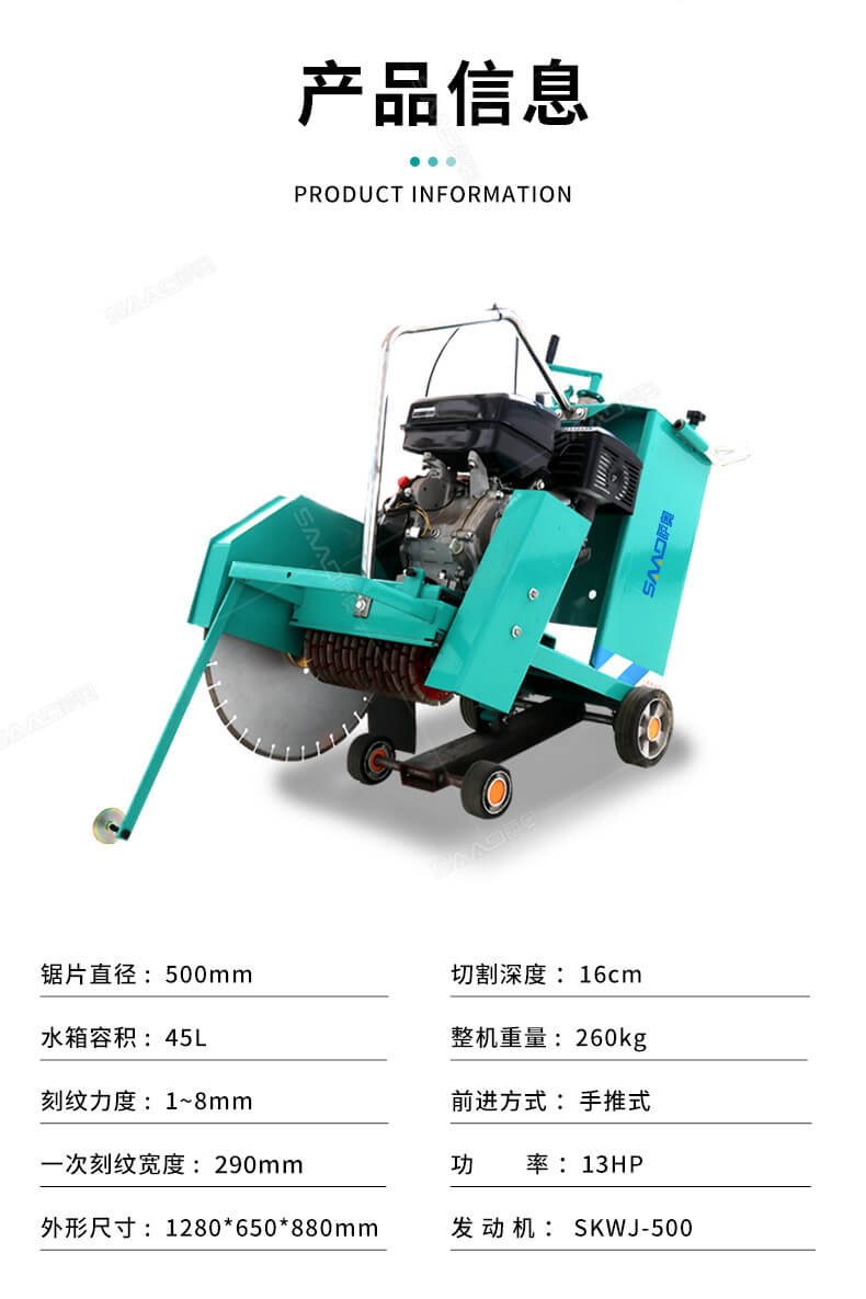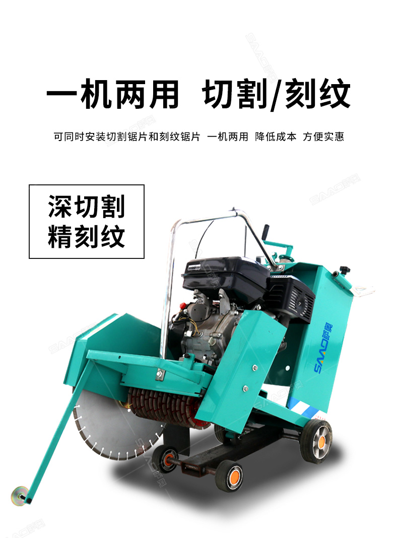 開槽刻紋兩用機(jī)產(chǎn)品特點(diǎn): 1.發(fā)動(dòng)機(jī)水平軸:軸徑25,7mm槽鍵 2.切割機(jī)刀片主軸軸承采用日本NSK調(diào)心球軸承,壽命長(zhǎng)。 3.切割機(jī)皮帶采用進(jìn)口V型三角帶,抗耐磨、抗高溫,壽命長(zhǎng)。 4.前