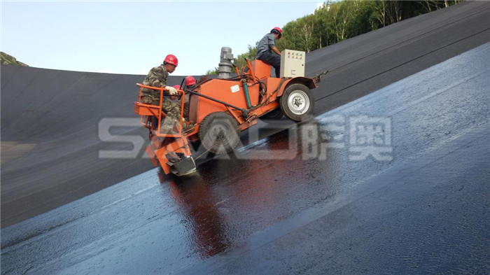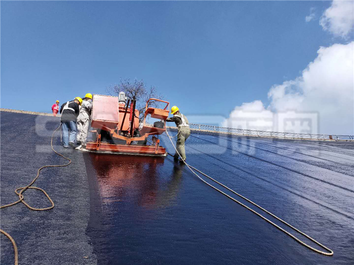 瀝青封閉層的施工采用適合于斜坡施工的專用瀝青瑪蹄脂涂刷機,在牽引臺車的牽引下沿著面板從下往上涂刷。涂刷完一個條帶后,將涂刷機移動至下一個條帶繼續涂刷。瑪蹄脂封閉層涂刷作業時環境氣溫應在10℃以上,涂刷溫度一般在170℃~190℃;施工完成的封閉層表面禁止無關人員和機械行走;特殊部位:壩頂及曲率半徑較小的圓弧斷,采用小型機械涂刷方式進行機械涂刷進行,環庫水平段及弧段全部采用小刮涂機配合人工進行刮涂施工。